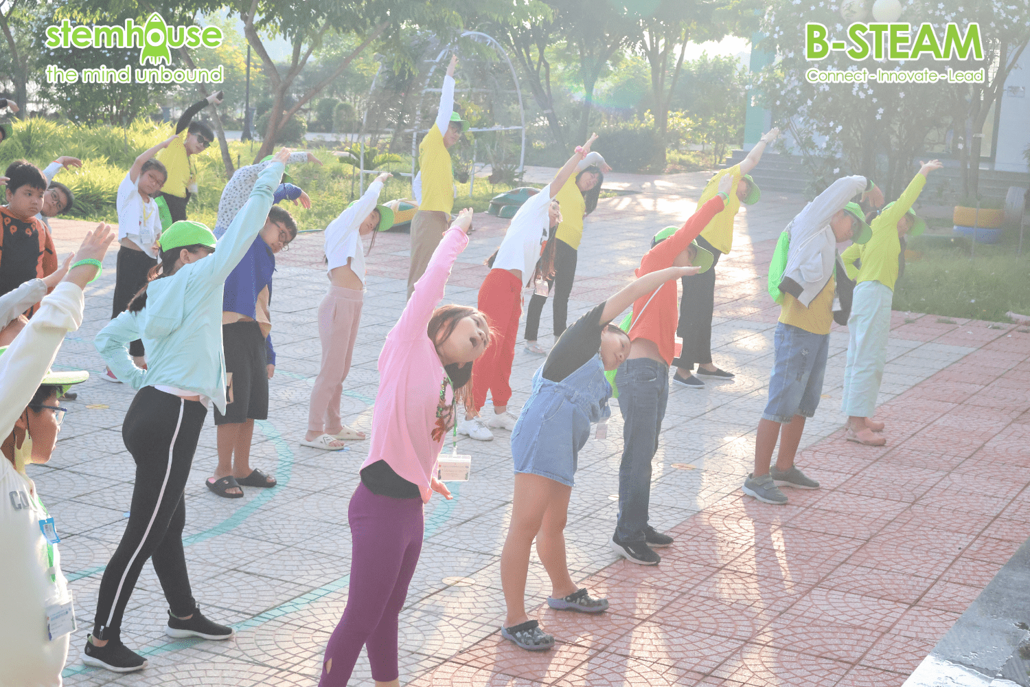 Các em bắt đầu ngày mới bằng việc tập thể dục buổi sáng. Họ thức dậy từ rất sớm để chuẩn bị cho chuyến hành trình dài hôm nay.