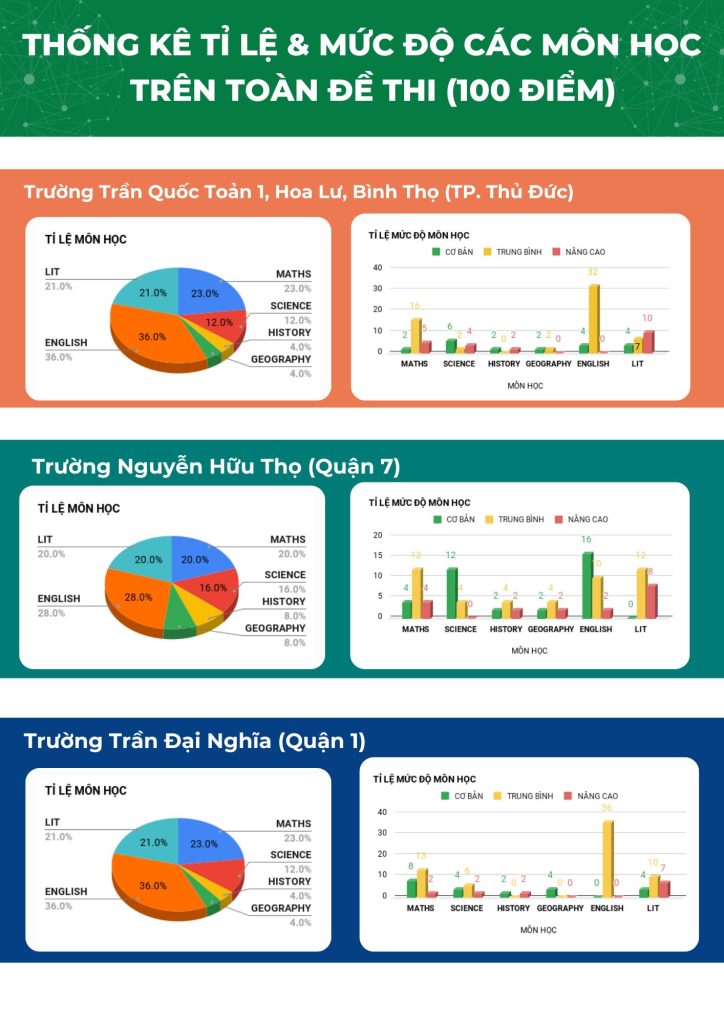 - Trường Nguyễn Hữu Thọ, Quận 7: Đề thi có phần nhấn mạnh vào môn Tiếng Anh và Toán, trong khi các môn khác có tỉ lệ thấp hơn. Mức độ khó của đề thi cũng tương đối ổn định.