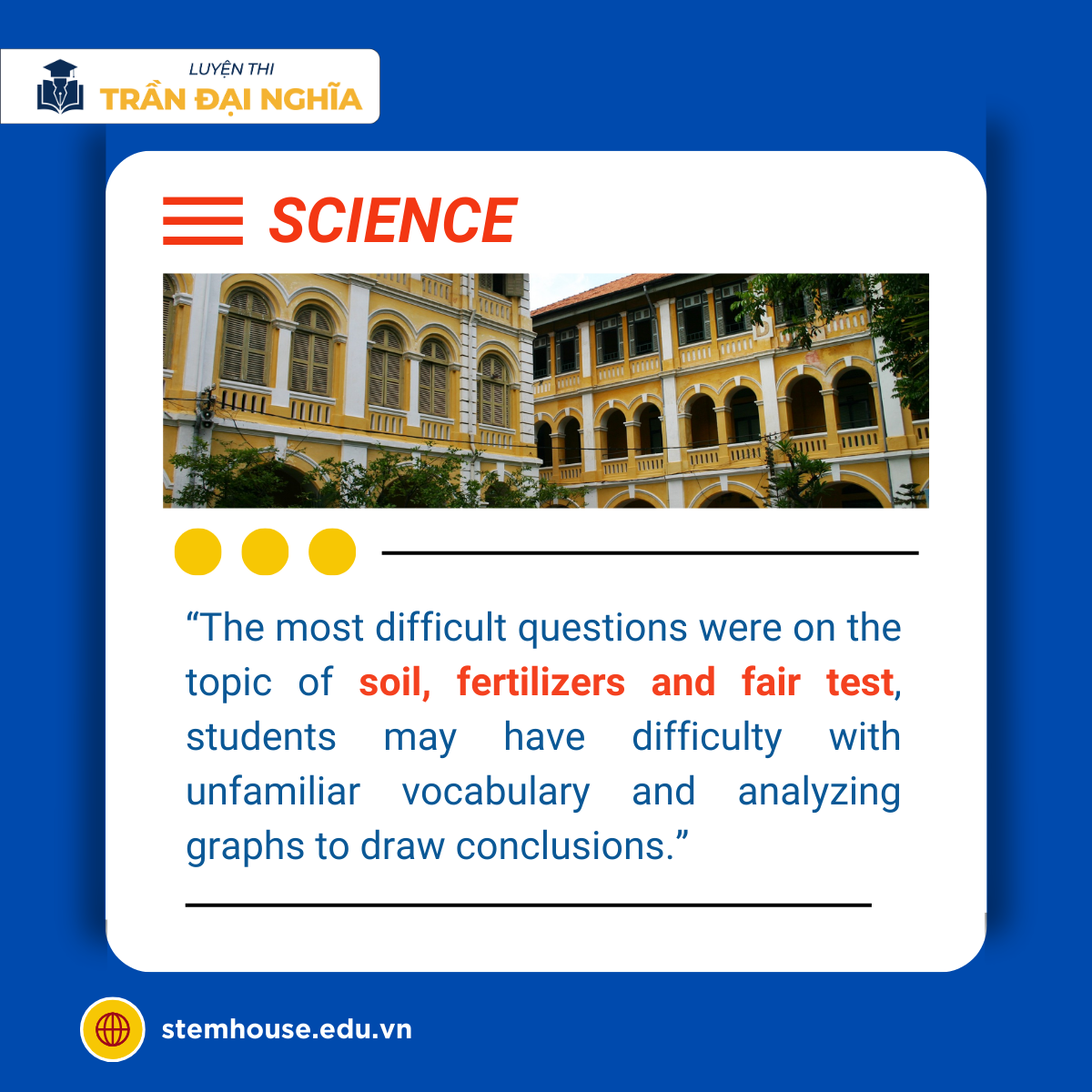 The Science questions in this exam are at a moderate level and at a basic level, most of them only require students to remember definitions and simple academic vocabulary, without requiring too much reasoning ability. The most difficult questions are related to the topic of soil, fertilizer and fair test, students may have difficulty with unfamiliar vocabulary and analyzing graphs to draw conclusions.