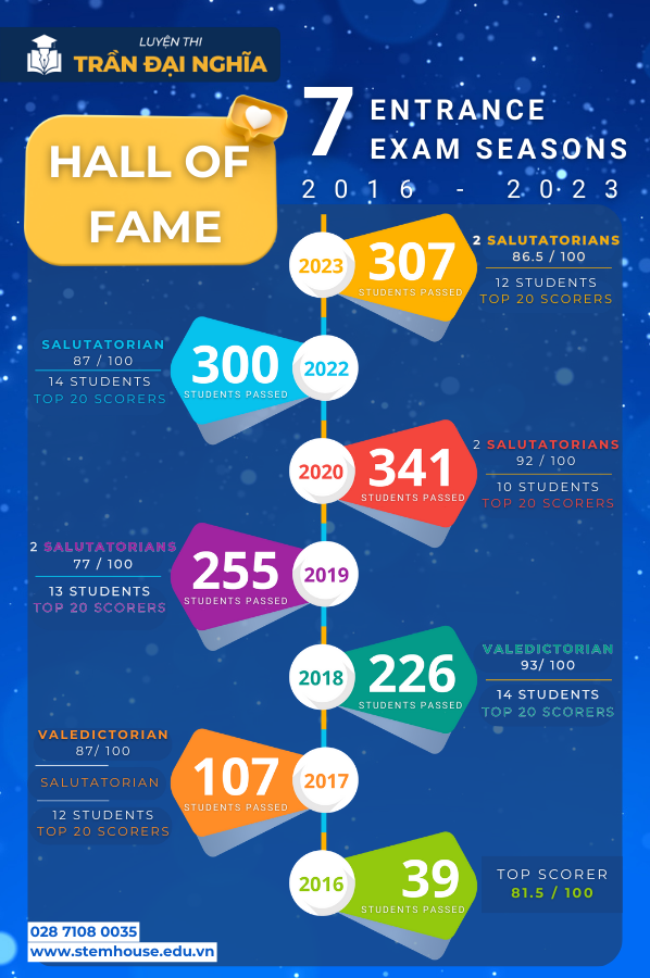 Over the past 10 years, Stemhouse has empowered over 1,500 students to gain admission to Trần Đại Nghĩa High School for the Gifted through our systematic curriculum, comprehensive skill development, and a team of highly qualified teachers across many fields.