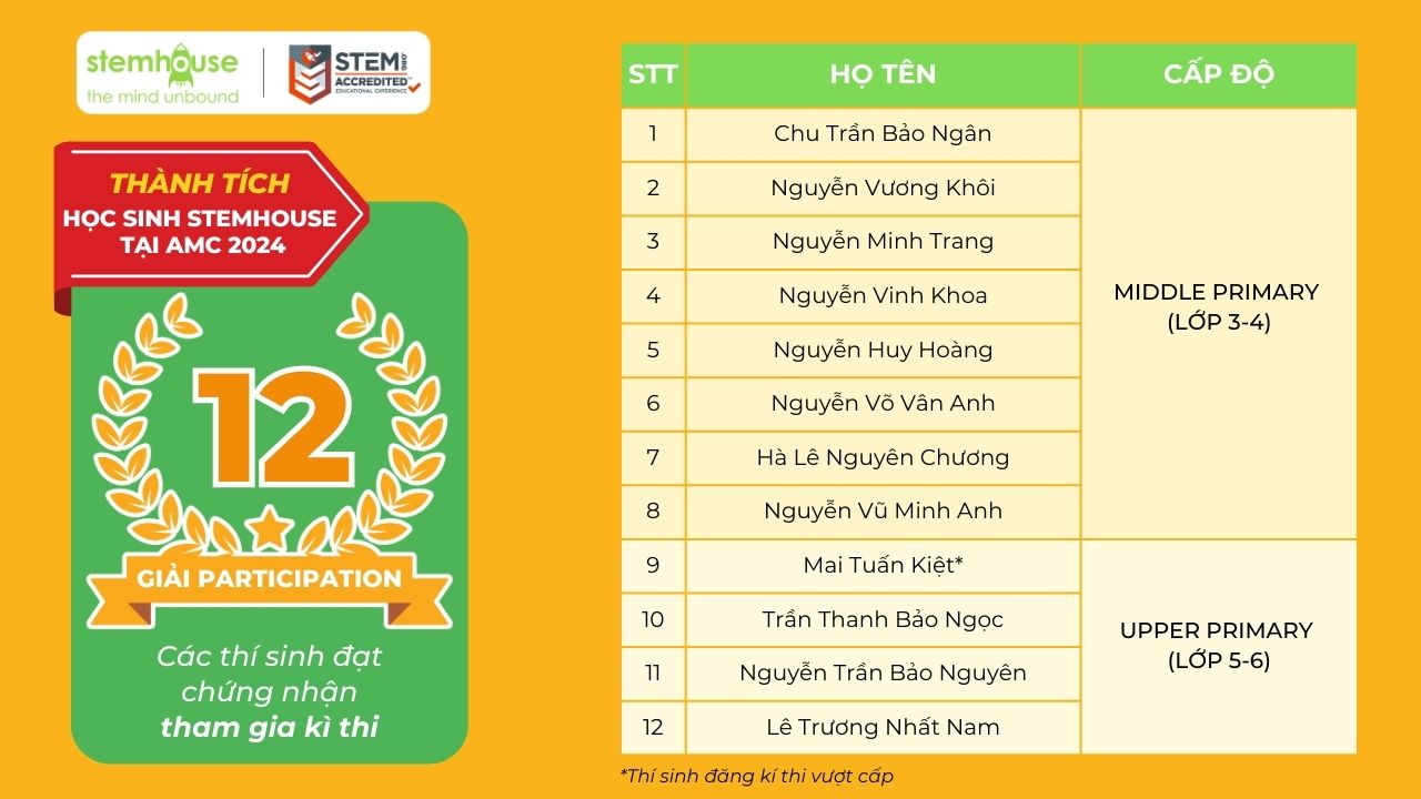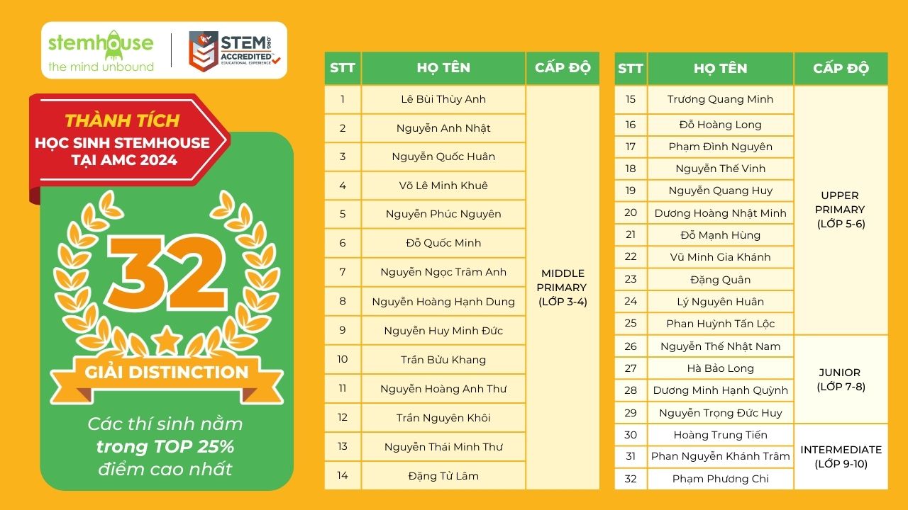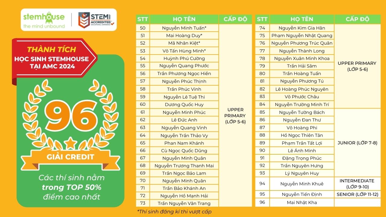 Stemhouse tự hào vinh danh 198 em học sinh đã đạt kết quả xuất sắc trong kì thi AMC 2024 vừa qua: