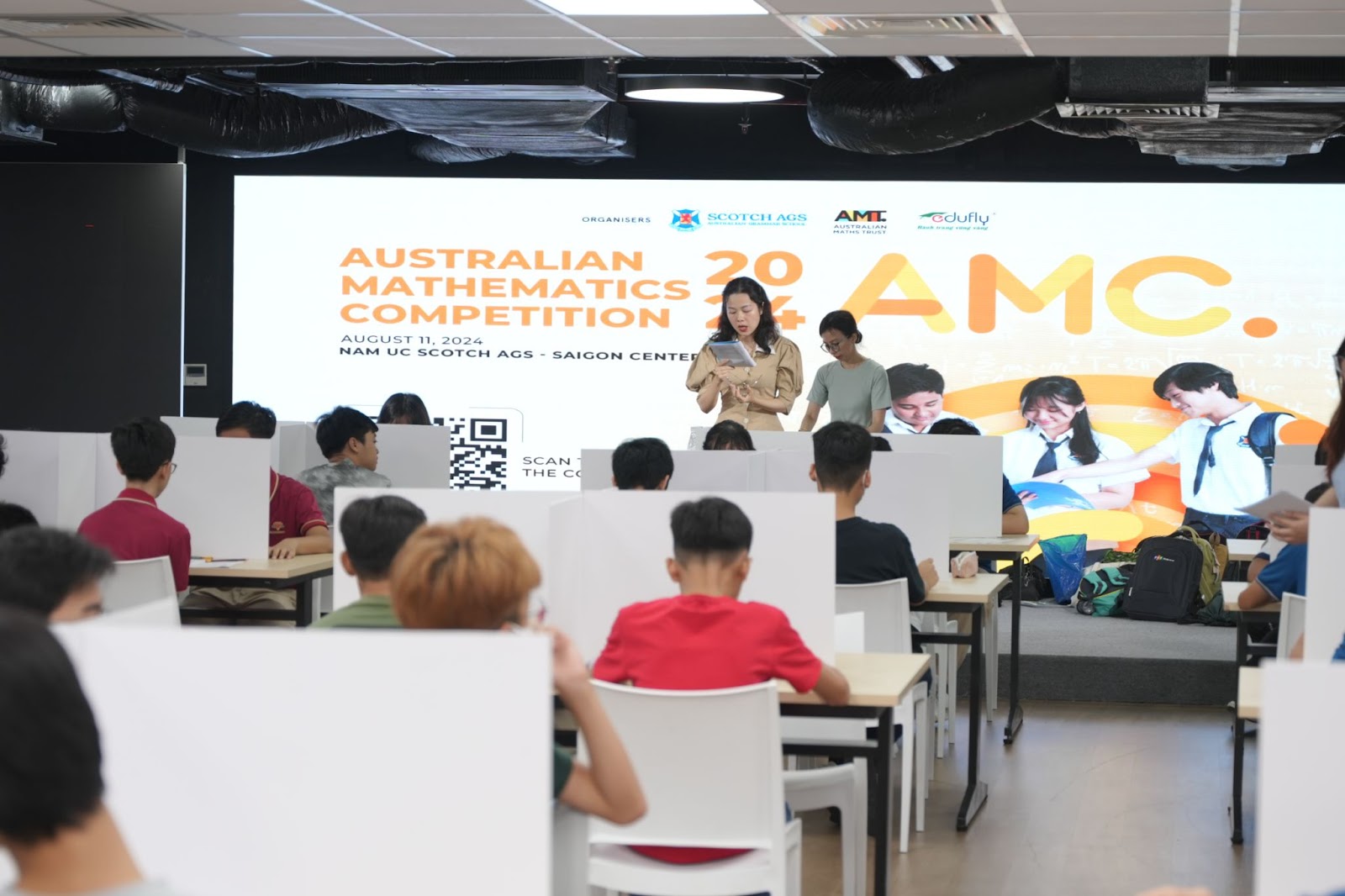Các thí sinh tham dự kì thi AMC 2024 nghe phổ biến quy chế thi trước khi bắt đầu làm bài